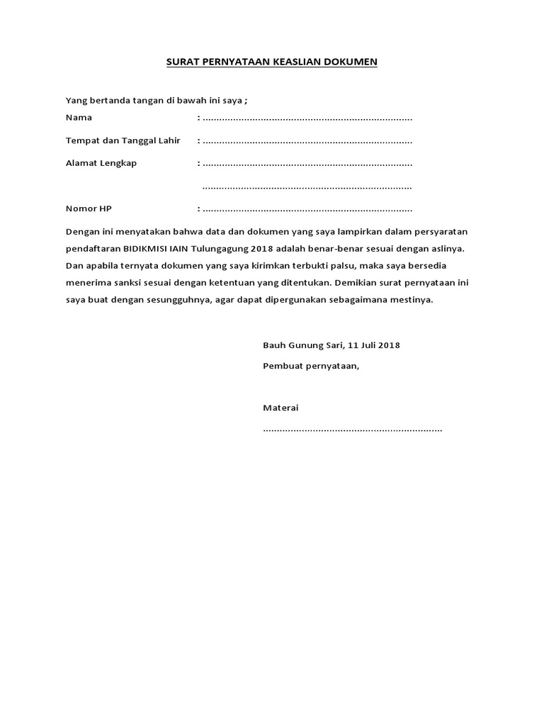 Surat Pernyataan Keabsahan Dokumen from imgv2-1-f.scribdassets.com Seluruh pernyataan data dan informasi beserta seluruh dokumen yang saya lampirkan dalam berkas pendaftaran seleksi penerimaan taruna baru politeknik Jun 21, 2021 · karena penerbitan surat bpkb impor dimulai dari surat pemberitahuan impor barang hingga hasil penelitian keabsahan surat pengimporan. Petugas kantor pertanahan akan verifikasi data anda jika dokumen sudah sesuai dengan data digital anda. Setelah validasi, silahkan datang ke kantor wilayah bpn provinsi atau ke direktorat jenderal infrastruktur keagrarian dengan membawa dokumen yang anda upload sebelumnya. Kartu tanda penduduk (ktp) dan kartu keluarga (kk) (fotokopi) wna : Kartu kartu izin tinggal terbatas (kitas) atau visa / paspor (fotokopi) Surat pernyataan kebenaran/keabsahan data yang bertanda tangan di bawah ini : Jun 17, 2021 · surat permohonan yang di dalamnya terdapat pernyataan kebenaran dan keabsahan dokumen dan data di atas kertas bermaterai rp6.000 wni: